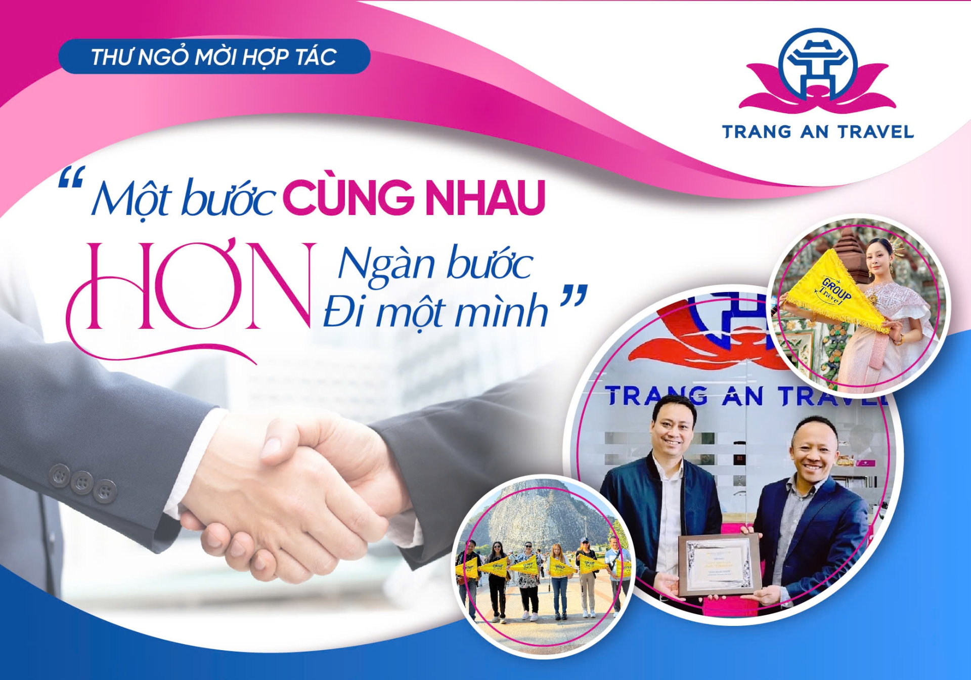 Tràng An Travel trân trọng mọi cơ hội hợp tác và hy vọng sớm cùng Quý Đối tác viết tiếp những chương mới, nơi mỗi hành trình là một trải nghiệm đáng nhớ - cùng đi, cùng chia sẻ, cùng phát triển bởi chúng ta đều hiểu một triết lý quen thuộc ‘Muốn đi nhanh thì đi một mình, muốn đi xa hãy đi cùng nhau’.